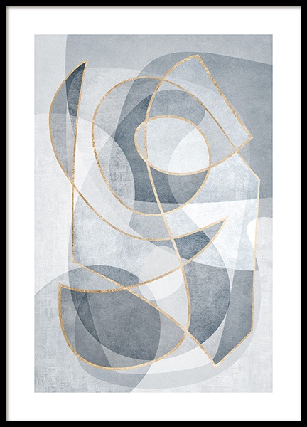Handpicked Abstrakter Kunstdruck mit grafischen Formen in Blau, von goldenen Linien umrandet. Bringe abstrakte und grafische Kunst an deine Wände und finde Harmonie mit beruhigenden Farben und weichen Formen.