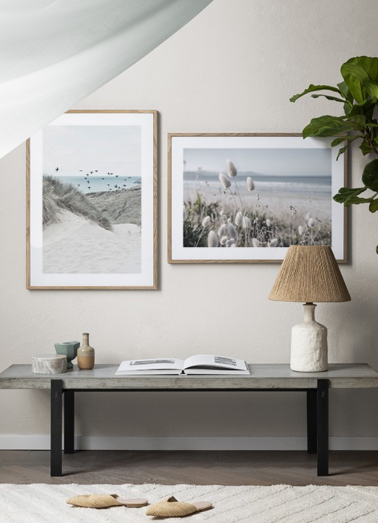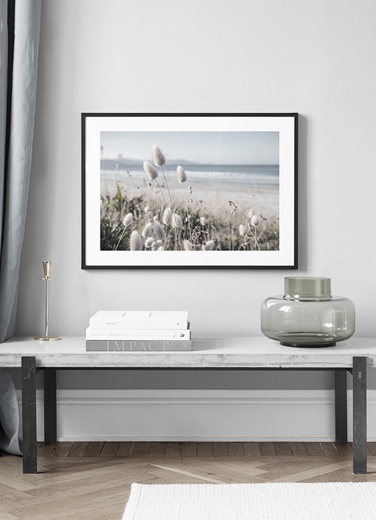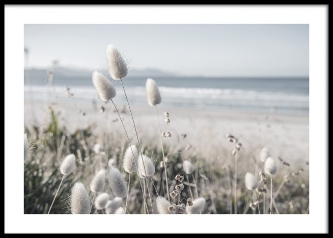 Handpicked Foto von weißem Dünengras mit einem Strand und dem Meer im Hintergrund. Diese verträumte Aussicht wird sowohl im Wohn- als auch im Schlafzimmer perfekt aussehen, je nachdem, welchen Stil du umsetzen möchtest!
