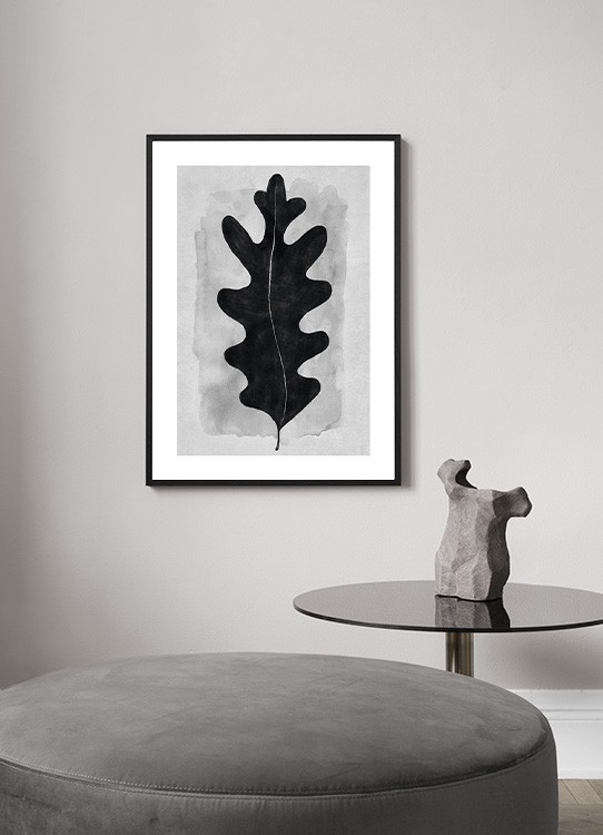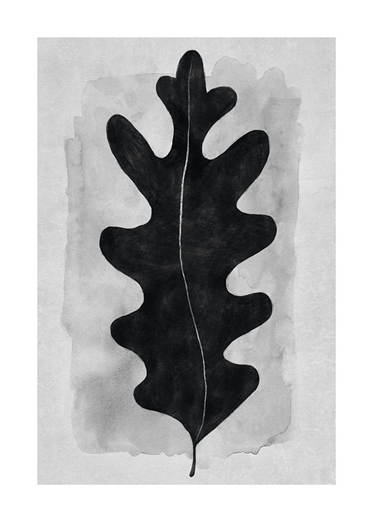 Handpicked Aquarell-Illustration eines schwarzen Eichenblattes vor grauem Hintergrund mit gesprenkelter Struktur. Eine monochrome Farbgestaltung passt perfekt in das Zuhause eines Minimalisten, und dieses Poster fügt sich nahtlos in deinen Wohnstil ein.