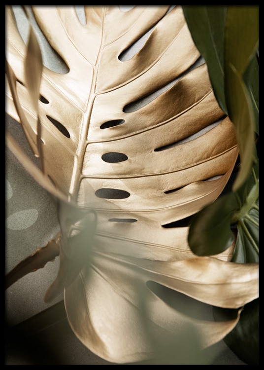 Handpicked Fotografie mit der Nahaufnahme eines goldenen Monstera-Blatts. Dieses luxuriöse Poster bringt einen eleganten Look in dein Zuhause. Kombiniere es mit anderen goldenen Postern für eine garantiert stilvolle Bilderwand. Wir haben viele Monstera-Poster in unserer Kategorie Botanik.