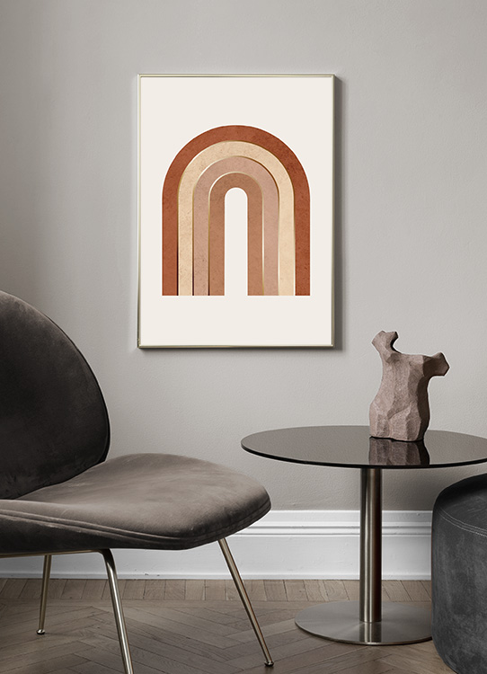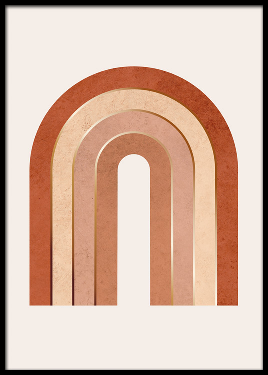 Handpicked Grafische Illustration eines Regenbogens in Rot und Beige mit goldenen Linien (keine Goldfolie) zwischen den Farben. Dieses lustige, farbenfrohe Poster passt genauso super ins Schlafzimmer wie ins Wohnzimmer, und zusammen mit einigen anderen grafischen Illustrationen kannst du eine schöne Bilderwand gestalten!