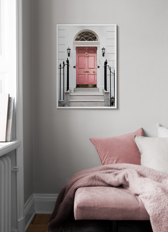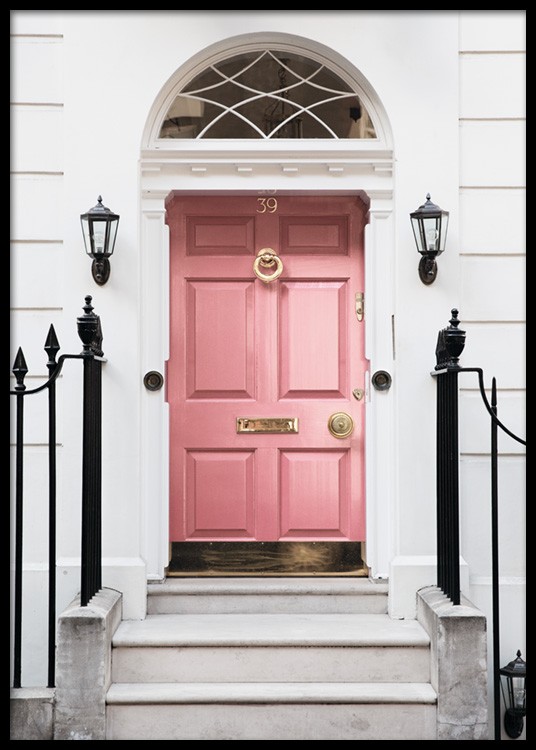 Handpicked Ein schönes Fotoposter, das ein weisses Gebäudes mit einer rosa Tür zeigt. Das Foto stammt aus dem Londoner Stadtteil Notting Hill, der für seine Eleganz und schönen Fassaden bekannt ist. Dieses Poster ist Teil von Studio Cosmopolitan, einer Fotokollektion, die von Desenio entwickelt wurde.