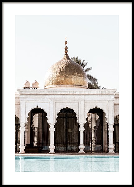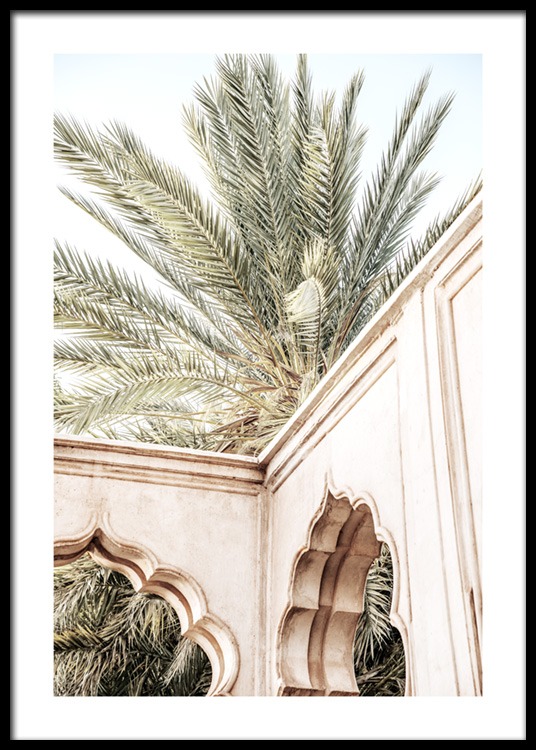 - Fotografie eines beigen Gebäudes mit geschwungenen Bögen vor einer Palme Fotografie einer Palme hinter einem Gebäude mit geschwungenen Bögen. Die detaillierte Architektur, die fantastische Kunstfertigkeit offenbart, ist nur ein kleines Stück der Schönheit von Marrakesch. Das Poster gehört zu Studio Amara, einer Fotokollektion, die vom Desenio Design Studio in Marrakesch aufgenommen wurde.