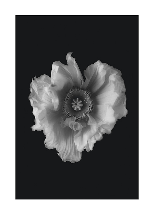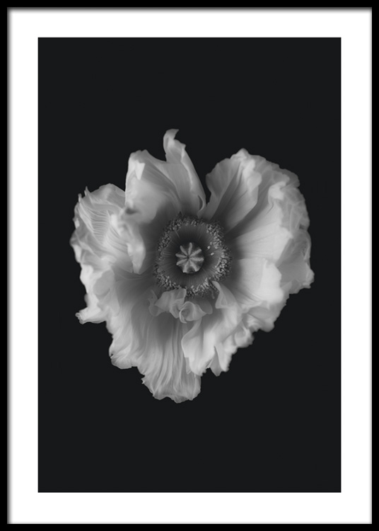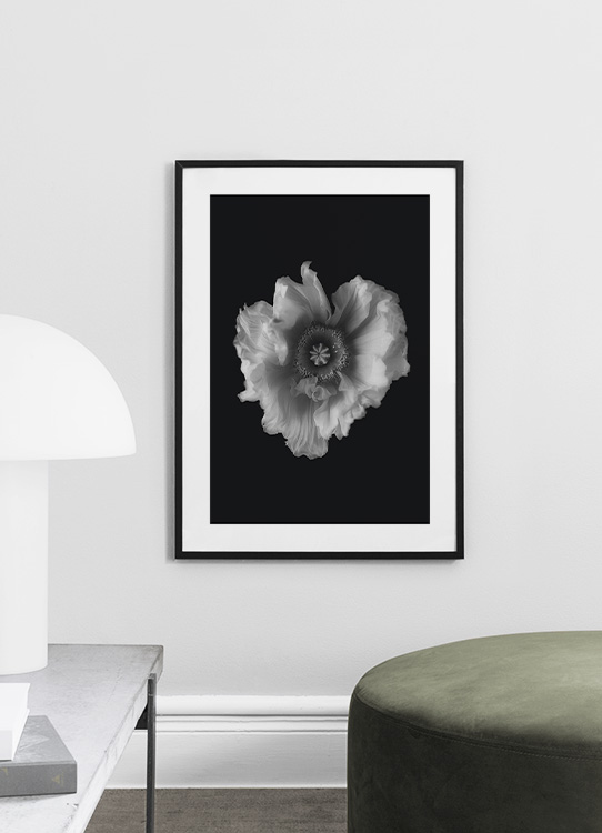 Handpicked Fotografie einer Mohnblume in Schwarz-weiß vor einem schwarzen Hintergrund. Schwarz-weiß-Poster passen in alle Räume und bringen einen klassischen zeitlosen Look ins Zimmer. Ein tolles Motiv fürs Wohn – und Schlafzimmer!