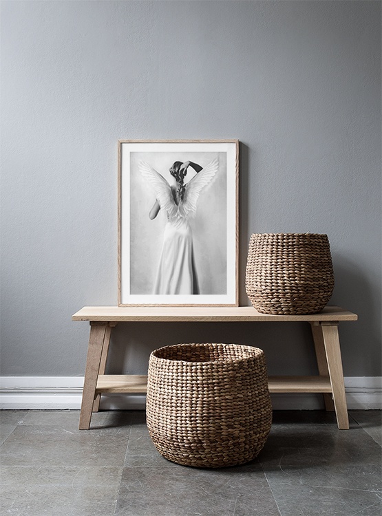 Handpicked Wir sind stolz darauf, die fantastischen Poster von Tove Frank anbieten zu können. Das Poster Lai aus Tove Franks Serie Essence ist ein schönes Fotoposter, auf dem eine Frau von hinten mit weissen Engelsflügeln porträtiert ist. Das verträumte Motiv in Schwarzweiss spiegelt Licht und Stimmung wider, denen Tove Frank mit ihrer Fotokunst Ausdruck verleiht. Das Poster hat einen ?eingebauten? Passepartout, der dem Foto einen schönen Rahmen verleiht.