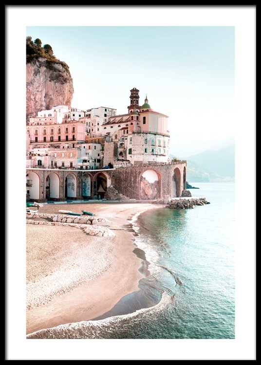 Image de nature avec une photo représentant des bâtiments au bord de la plage sur la côte amalfitaine, en Italie. Les bâtiments historiques avec tout leur caractère sont parfaitement adaptés à une composition murale, avec d'autres affiches de la catégorie Nature ou Cartes et villes.