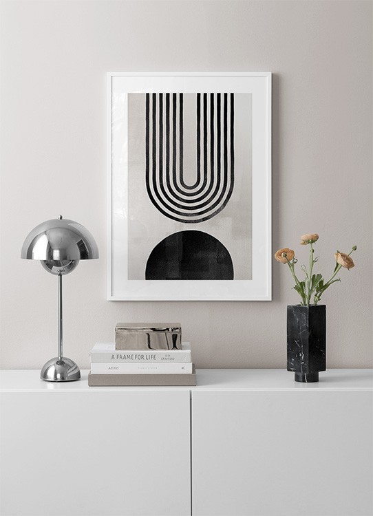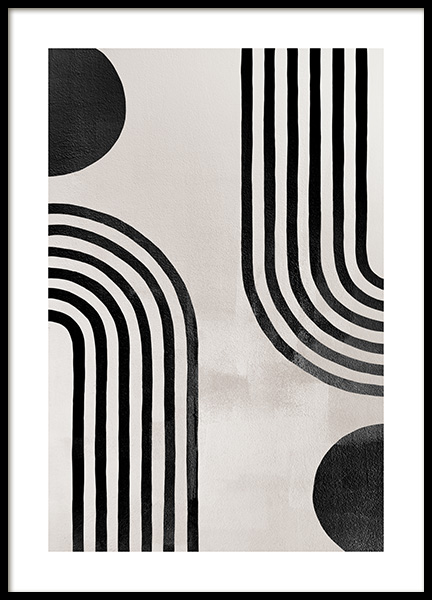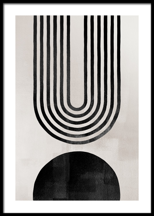 – Arche abstraite en noir composée de lignes avec une forme noire en dessous et un fond beige
