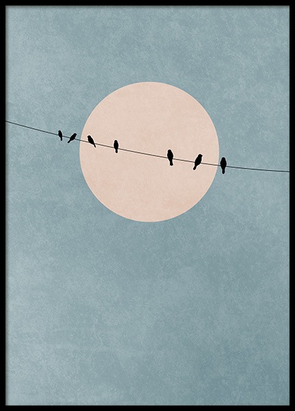 Illustration graphique d’une volée d’oiseaux devant une lune rose et un ciel bleu. Ajoutez un peu d’art graphique à votre intérieur pour une touche moderne et fraîche ! Les belles couleurs créent une impression de douceur et un sentiment de pleine conscience dans votre maison. Tout ce qu’il faut pour faire de votre espace de vie votre lieu de prédilection.