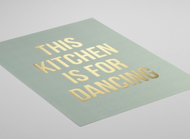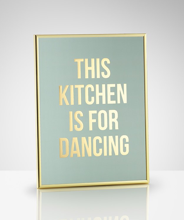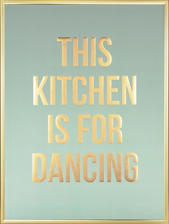 Affiche de citation avec le texte « This kitchen is for dancing » imprimé sur une feuille d’or avec un fond vert. La feuille d’or donne à l’affiche une finition brillante, ce qui la rend parfaite pour votre espace de cuisine. Si vous voulez d’autres affiches assorties, vous trouverez un multitude de motifs dans notre catégorie Cuisine !