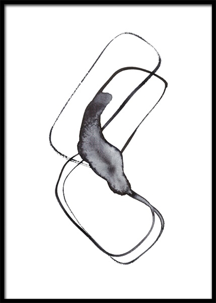 – Peinture à l’aquarelle en gris foncé d’une forme abstraite et de fines volutes sur un fond blanc