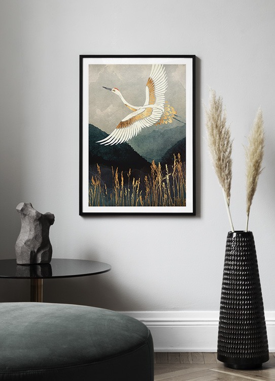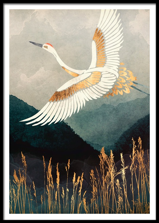 Illustration graphique d'une grue blanche et dorée (il ne s'agit pas d'une feuille d'or) volant au-dessus de montagnes. Cette jolie affiche ajoutera la touche de couleur dont votre intérieur a besoin pour avoir l'air métamorphosé.
