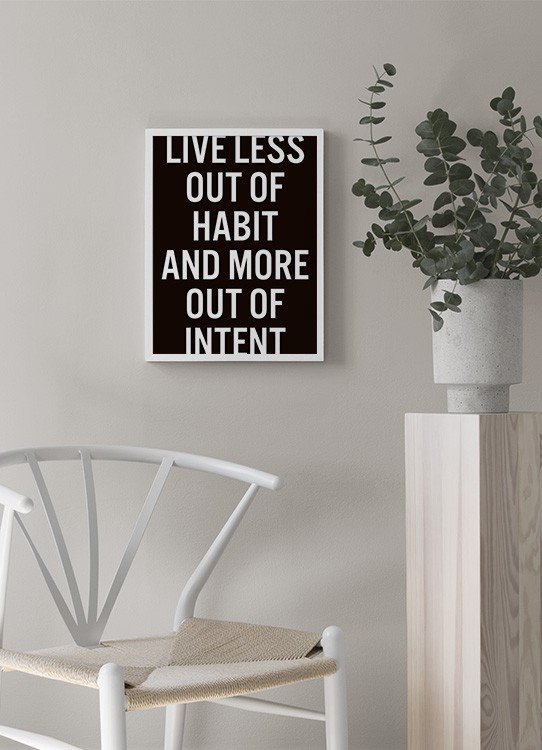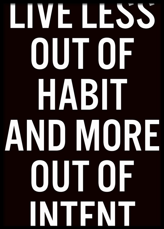 Affiche de texte avec la citation « Live less out of habit and more out of intent » en blanc sur un fond noir. Rompre les habitudes est la première étape vers le changement, et avec cette affiche, vous en aurez un rappel quotidien. Placez l’affiche dans un endroit que vous fréquentez souvent et vous ne passerez jamais à côté !