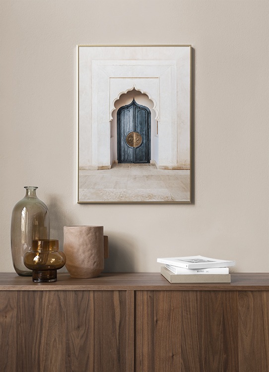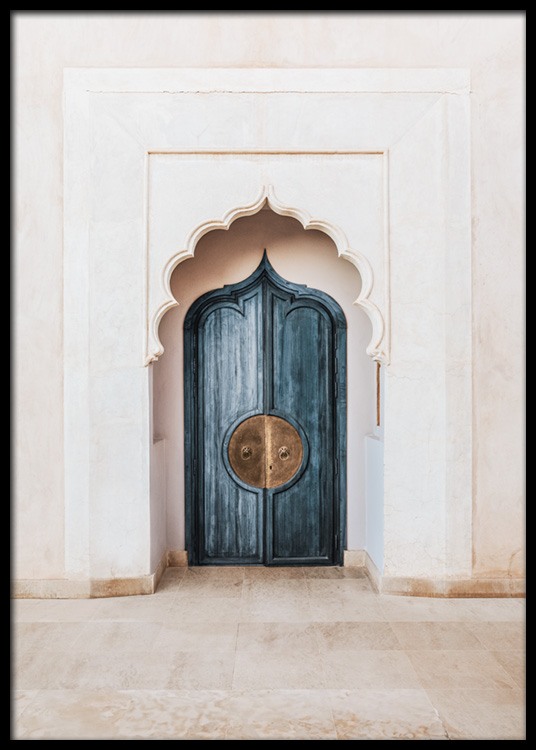 Photographie d'une porte bleue aux poignées dorées, et une arche formant des vagues juste avant. Riche en détails, l'architecture de Marrakech nous époustoufle à chaque fois ! Ce poster fait partie de Studio Amara, une collection réalisée par le Studio Design de Desenio à Marrakech.