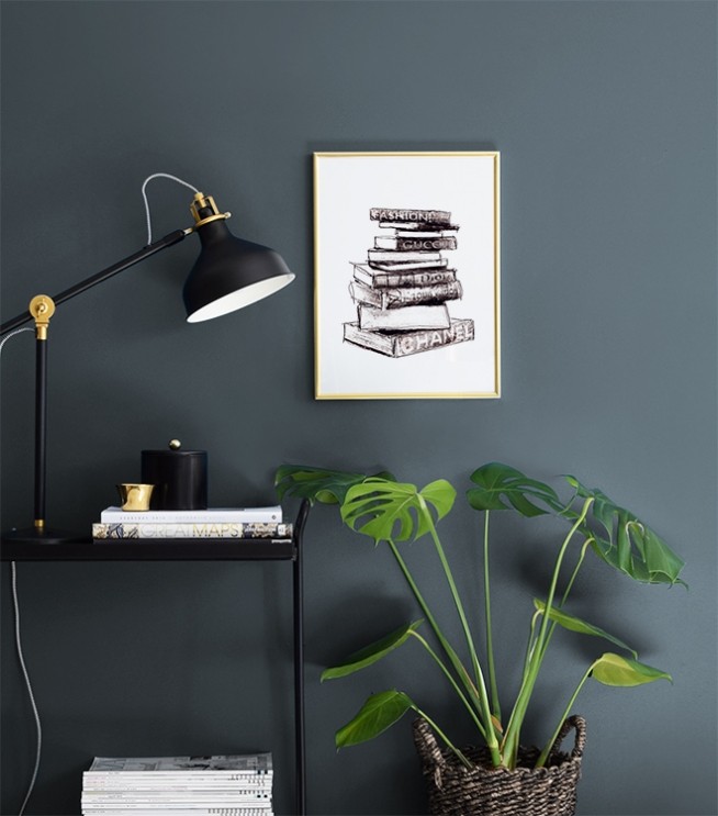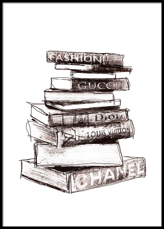 Poster avec des livres portant le nom des plus grandes maisons de couture comme Dior, Chanel, Gucci etc. Une superbe illustration. Grâce à ses tons neutres, ce poster convient à la plupart des intérieurs. Peut être combiné dans un collage tendance.