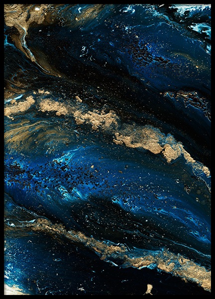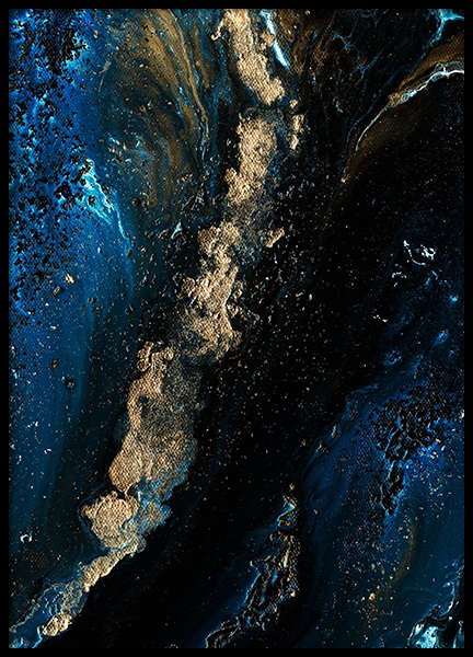 Peinture abstraite en blanc, bleu et doré. La peinture originale a été peinte en acrylique sur une toile, ce qui rend les coups de pinceau et la structure de la toile visibles sur l’affiche. Si vous voulez créer un bel intérieur, l’art abstrait est votre nouveau meilleur ami ! Avec les tourbillons et les couleurs audacieuses, ce poster ajoute une impression de luxe.
