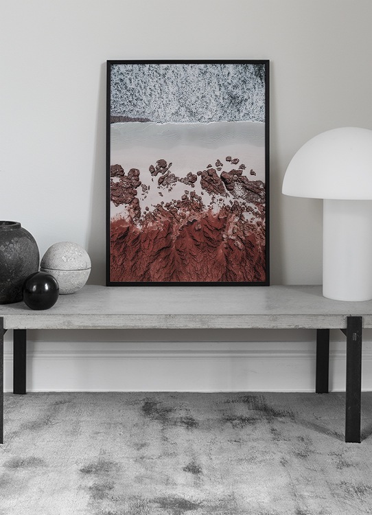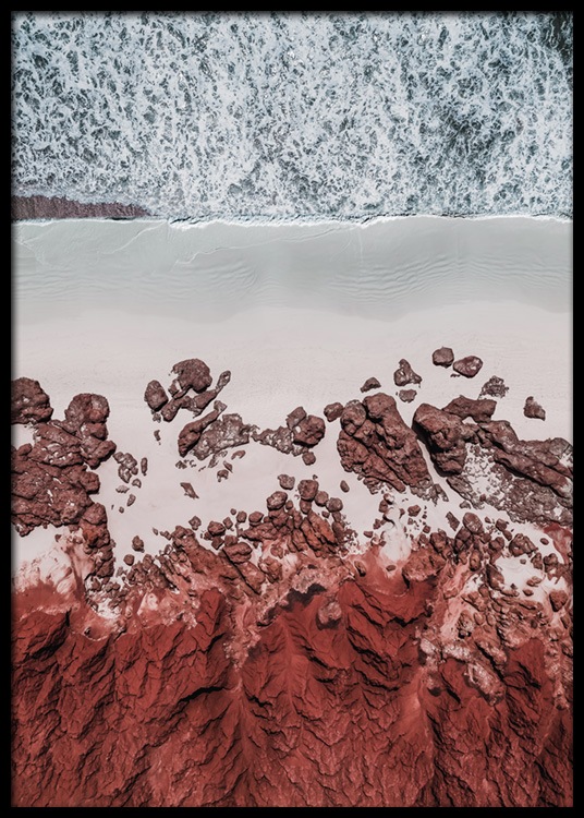 Photographie aérienne d'une plage avec des rochers et du sable rouges. L'art photographique coloré est idéal si vous souhaitez une déco murale imposante et cherchez une pièce centrale qui attire l'oeil. Associez cette affiche avec d'autres photos pour une déco plus complète !