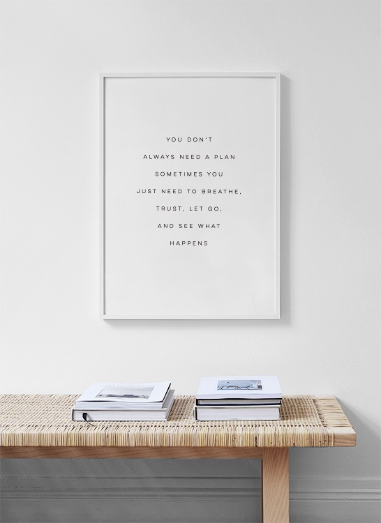 Tableau à texte en noir et blanc. Cette affiche avec une citation en anglais est parfaite comme décoration dans la plupart des pièces et rappelle l’importance de la liberté et de la confiance en soi. Le texte anglais de ce tableau dit : « You don't always need a plan, sometimes you just need to breathe, trust, let go, and see what happens! » Nous proposons une large sélection d’affiches avec des citations philosophiques ou amusantes que vous trouverez dans la catégorie Affiches à citations.