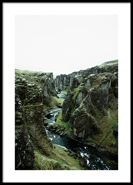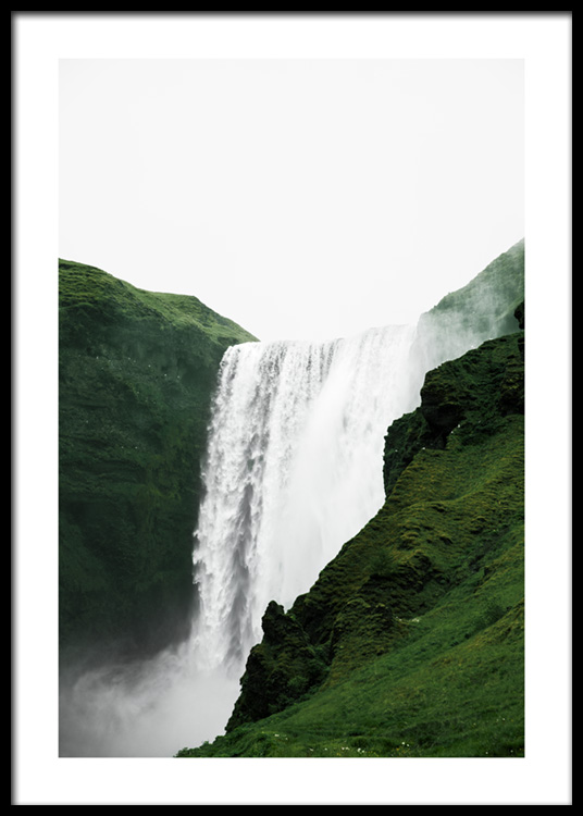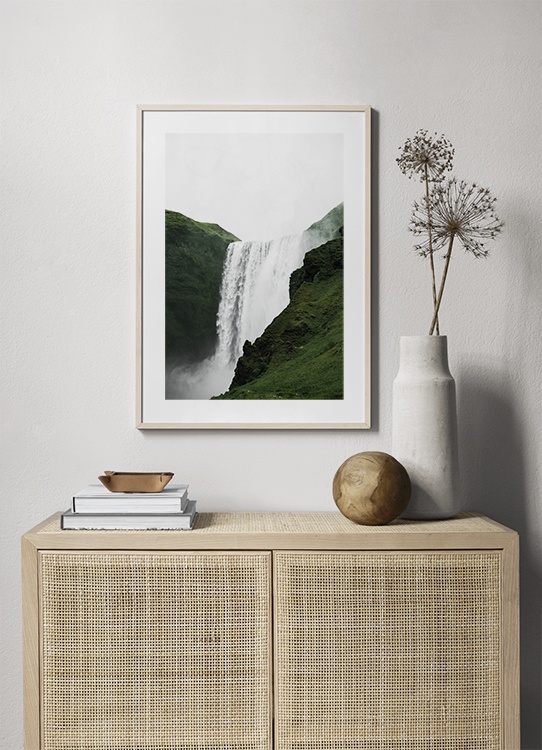Photographie de la cascade de Skogafoss et d'un paysage vert en Islande. Trouvez votre affiche préférée de Studio Elements - une collection de photos exclusive de Desenio Design Studio. Découvrez la magie et ressentez le pouvoir de la nature.