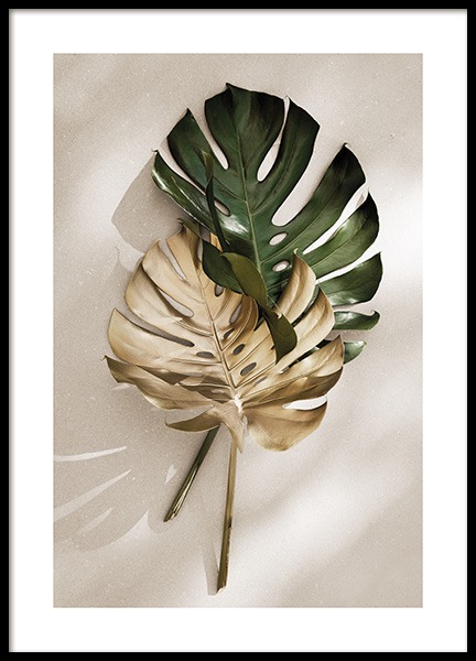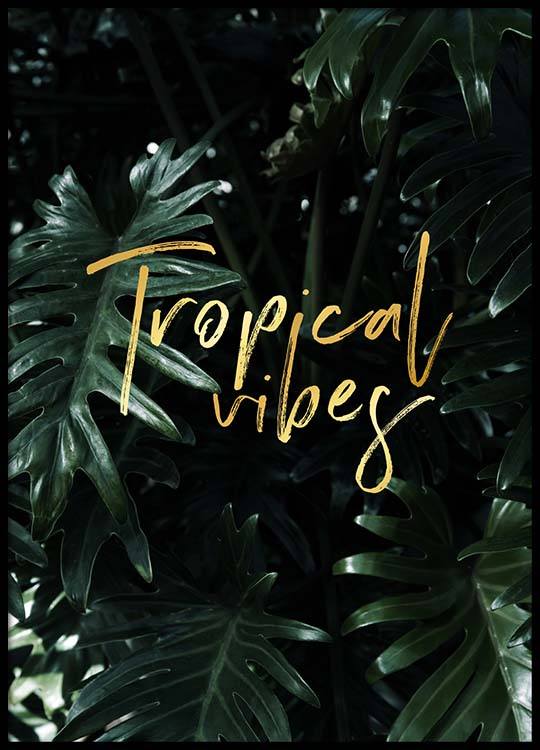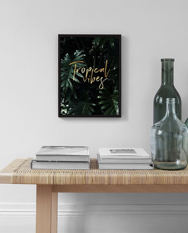 Photographie de feuilles vert foncé et la citation « Tropical vibes » en feuille d’or au milieu. Rejoignez la tendance tropicale avec cette super affiche ! Ce motif va à coup sûr insuffler une nouvelle vie dans votre maison, et vous pouvez l’assortir avec d’autres affiches de notre catégorie Or et argent.