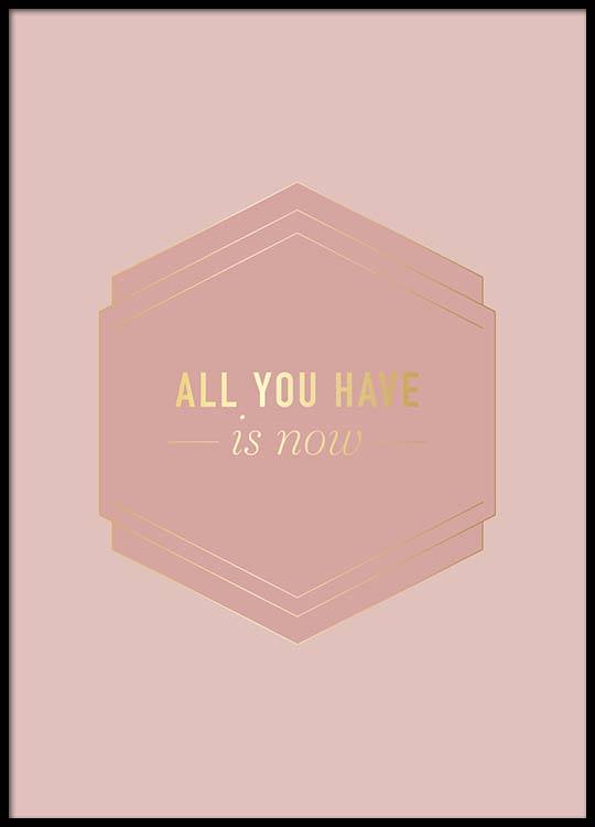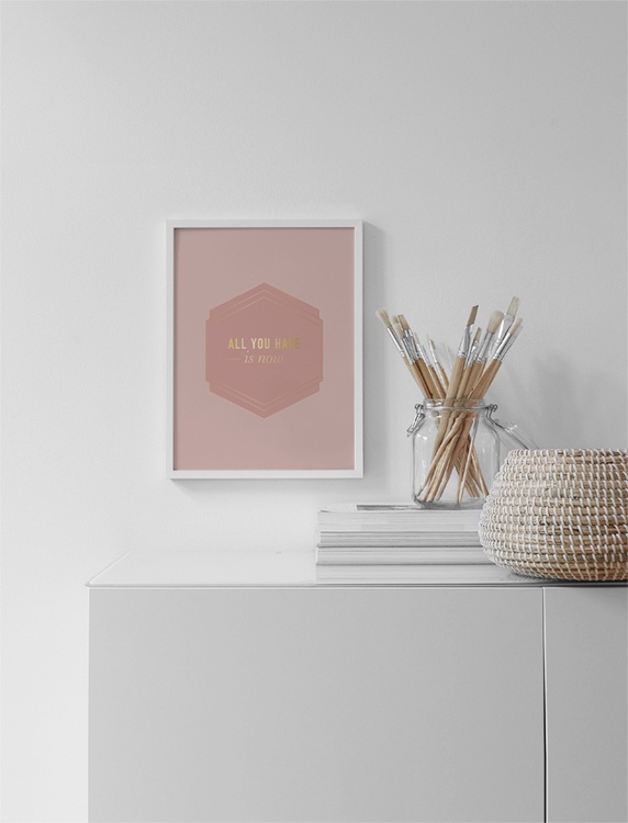 Motivi Handpicked Illustrazione grafica di una forma geometrica con bordi color oro e il testo "All you have is now" scritto in color oro al suo interno, su sfondo rosa. Questo poster luminoso e colorato è ideale sia per la camera da letto che per la stanza di un adolescente e, se lo abbini ad altri nostri soggetti sulla moda, puoi creare una perfetta galleria a parete personalizzata.