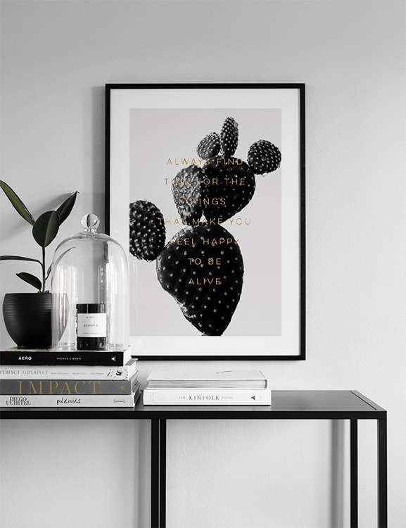 Motivi Handpicked Fotografia in bianco e nero di un cactus con il testo "always find time for the things that make you feel happy to be alive" scritto in color oro. Ricordati delle cose importanti della vita e di trovare il tempo per fare ciò che ami!