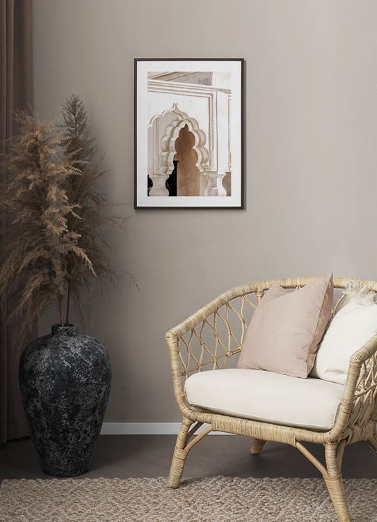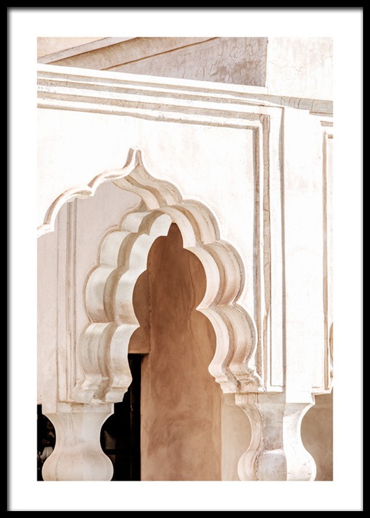 Motivi Handpicked Fotografia di un edificio beige con un arco moresco. Marrakech è nota per la sua squisita architettura antica in colori vivaci con dettagli dorati e questa collezione cattura veramente tutta la sua bellezza. Questo poster fa parte di Studio Amara, una collezione di fotografie scattate da Desenio Design Studio a Marrakech.