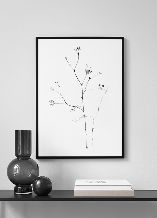 Motivi Handpicked Fotografia in bianco e nero di piccoli fiori su rami sottili su sfondo bianco. Questo poster floreale minimalista è perfetto per completare una galleria a parete con fotografie artistiche in bianco e nero, ma puoi anche abbinarlo ad altri stili floreali che ami. Cercali nella nostra collezione Fiori e piante!