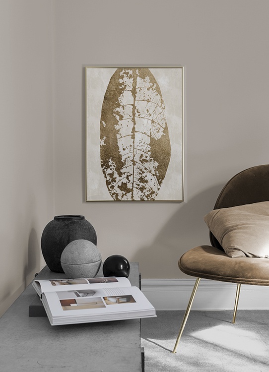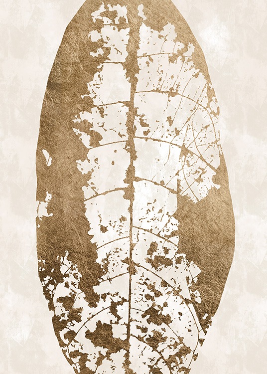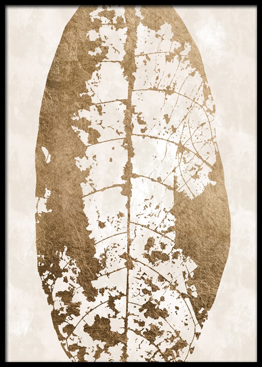 - Stampa artistica astratta di una foglia color oro con nervature visibili, su sfondo beige