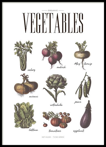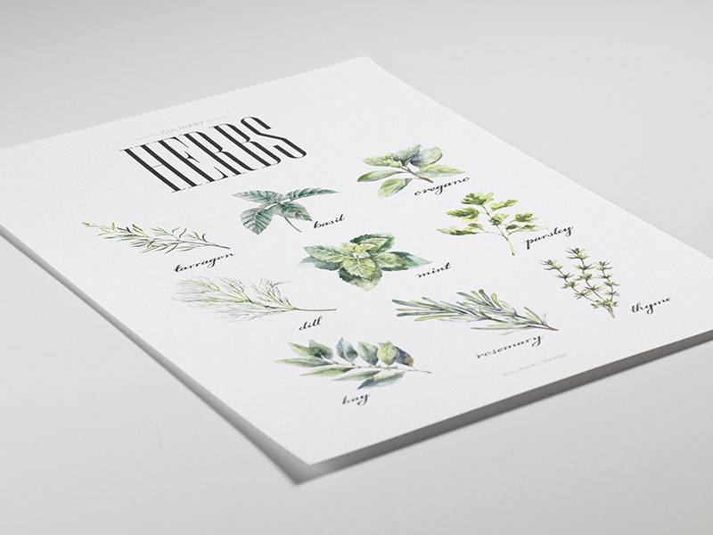 Affisch med örter till köket. Kökstavla med gröna illustrationer.