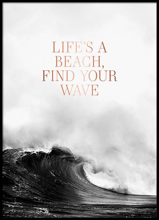 Motivi Handpicked Fotografia in bianco e nero di una grande onda con il testo "Life's a beach, find your wave" scritto in color rame. Guardando questo poster, in cui un soggetto tipografico si fonde perfettamente con un soggetto fotografico, sembra quasi di sentire il dolce sciabordio delle onde che si infrangono sulla spiaggia.