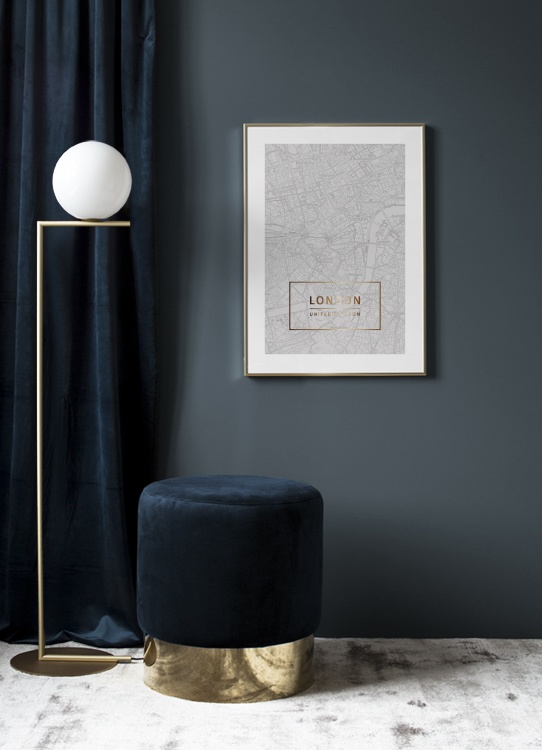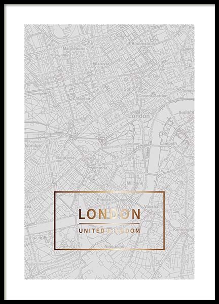 Motivi Handpicked Mappa di Londra in grigio con il testo "London United Kingdom" scritto in color oro e incorniciato in un rettangolo color oro. Se hai un debole per questa città, decora le tue pareti con poster con soggetti di Londra!