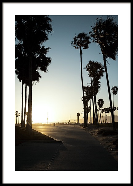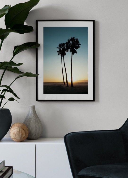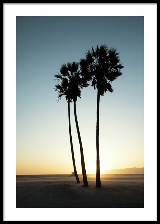 Motivi Handpicked Palme, spiaggia e tramonto: una combinazione perfetta che il nostro team creativo cattura in questa immagine eccezionale scattata lungo la spiaggia di Los Angeles. Il sole tramonta velocemente ma riusciamo a immortalarlo proprio al momento giusto inondando di calore la fotografia. Il poster è caratterizzato da un bordo bianco tutto attorno che incornicia elegantemente il soggetto.