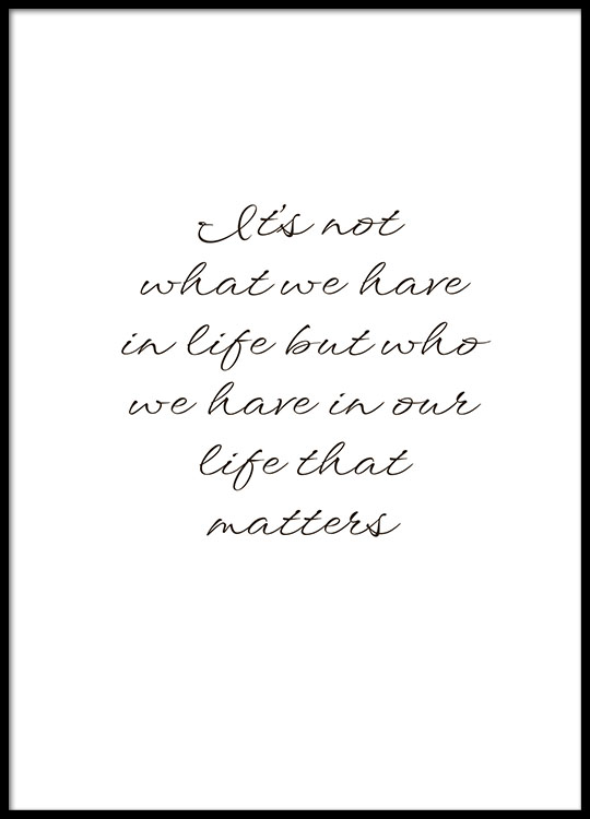 Motivi Handpicked Poster con il testo "It's not what we have in our life, but who we have in our life that matters". Una citazione densa di significato, che invita riflettere ed è anche perfetta per il corridoio o la camera da letto. Puoi trovare altri poster con testi e citazioni nella nostra collezione Testi e citazioni.