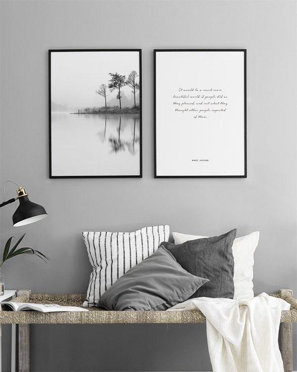 Motivi Handpicked Poster con paesaggio scandinavo in bianco e nero. Un design molto elegante e rilassante con un bellissimo lago e riflessi. Questo poster funziona bene da solo, ma anche con altre fotografie o perché non immagini di ispirazione Mindfulness? Per un quadro veramente completo è possibile acquistare una bella cornice.