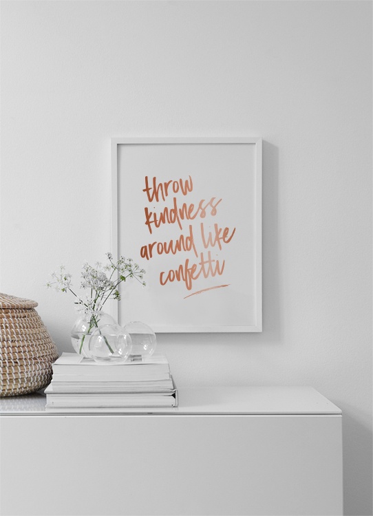 Motivi Handpicked Poster con il testo "Throw kindness around like confetti" scritto in corsivo in color rame su sfondo bianco. La gentilezza non si dovrebbe mai sottovalutare e se decori le tue pareti con poster che ti ricordano le piccole cose importanti della vita non te ne dimenticherai più!