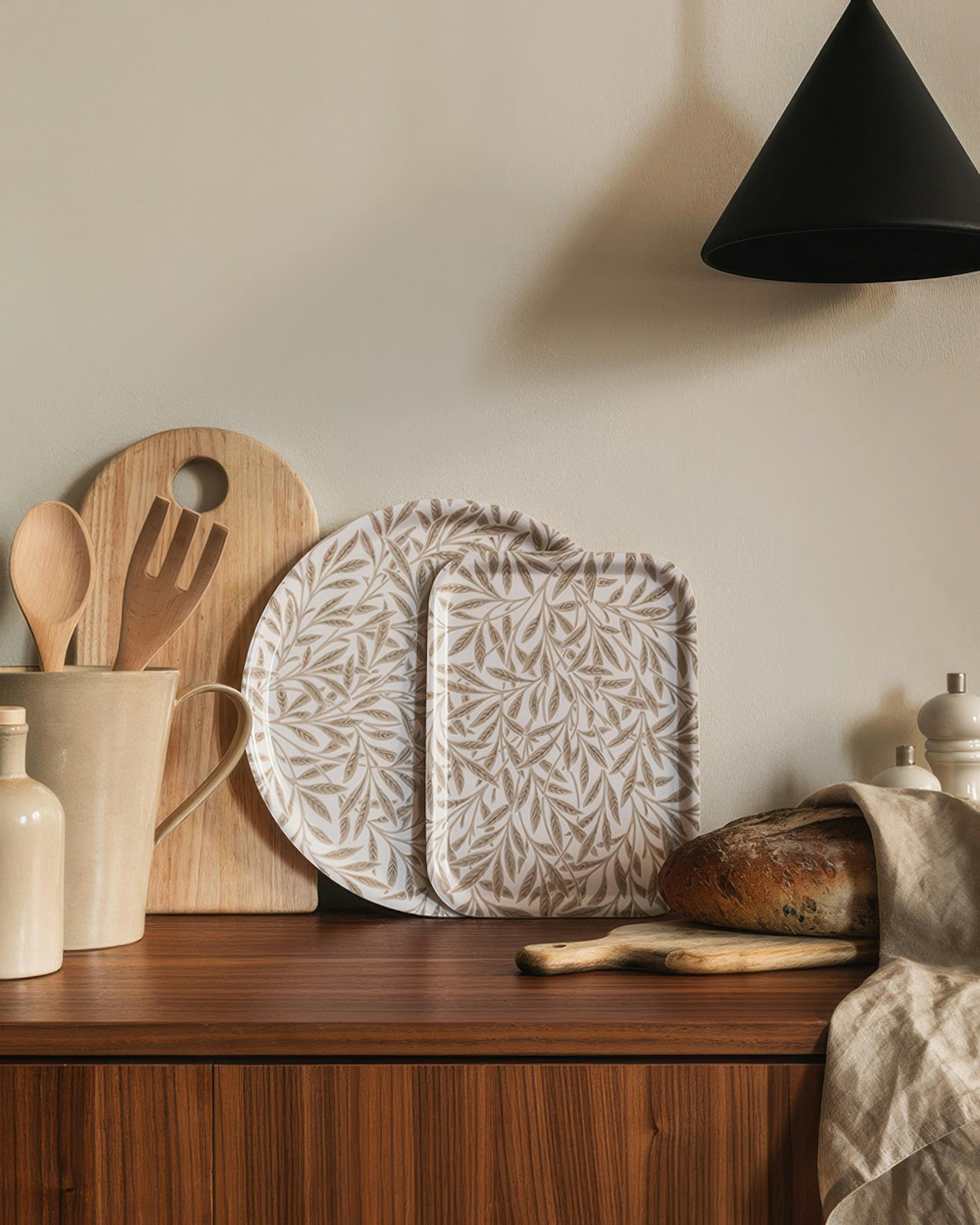 Ab CHF 36.95William Morris-Design auf einem rechteckigen Tablett mit braun-beigen Blättern auf weißem Hintergrund. Verschönere dein Zuhause mit einem eleganten Serviertablett von Desenio.