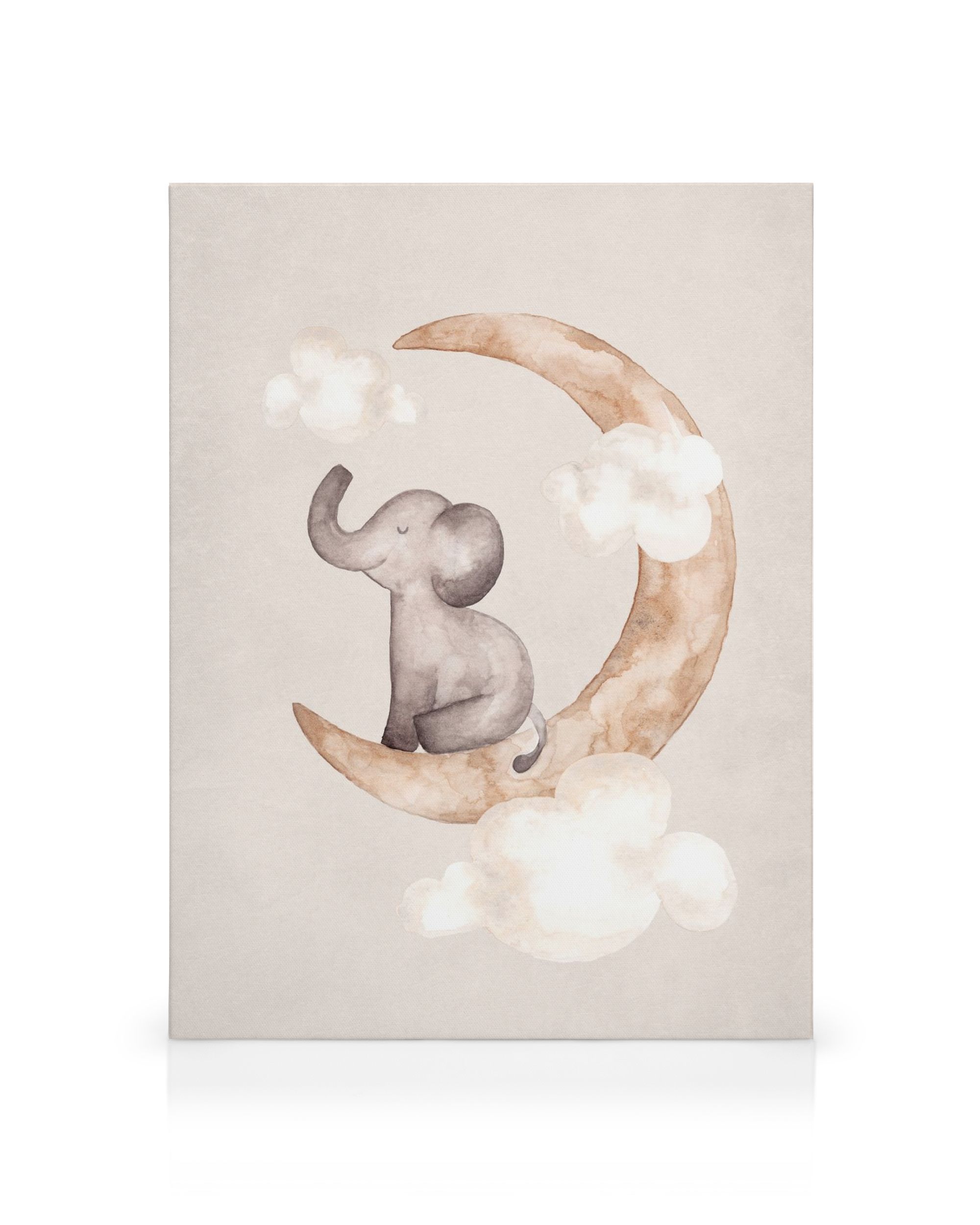 Aquarell-Malerei eines Elefantenbabys, das vor einem beigen Hintergrund von Wolken umgeben auf einem beigen Mond sitzt. Diese wunderschöne Illustration ist perfekt für ein Kinderzimmer, noch schöner wird sie in Kombination mit Dreaming Whale!