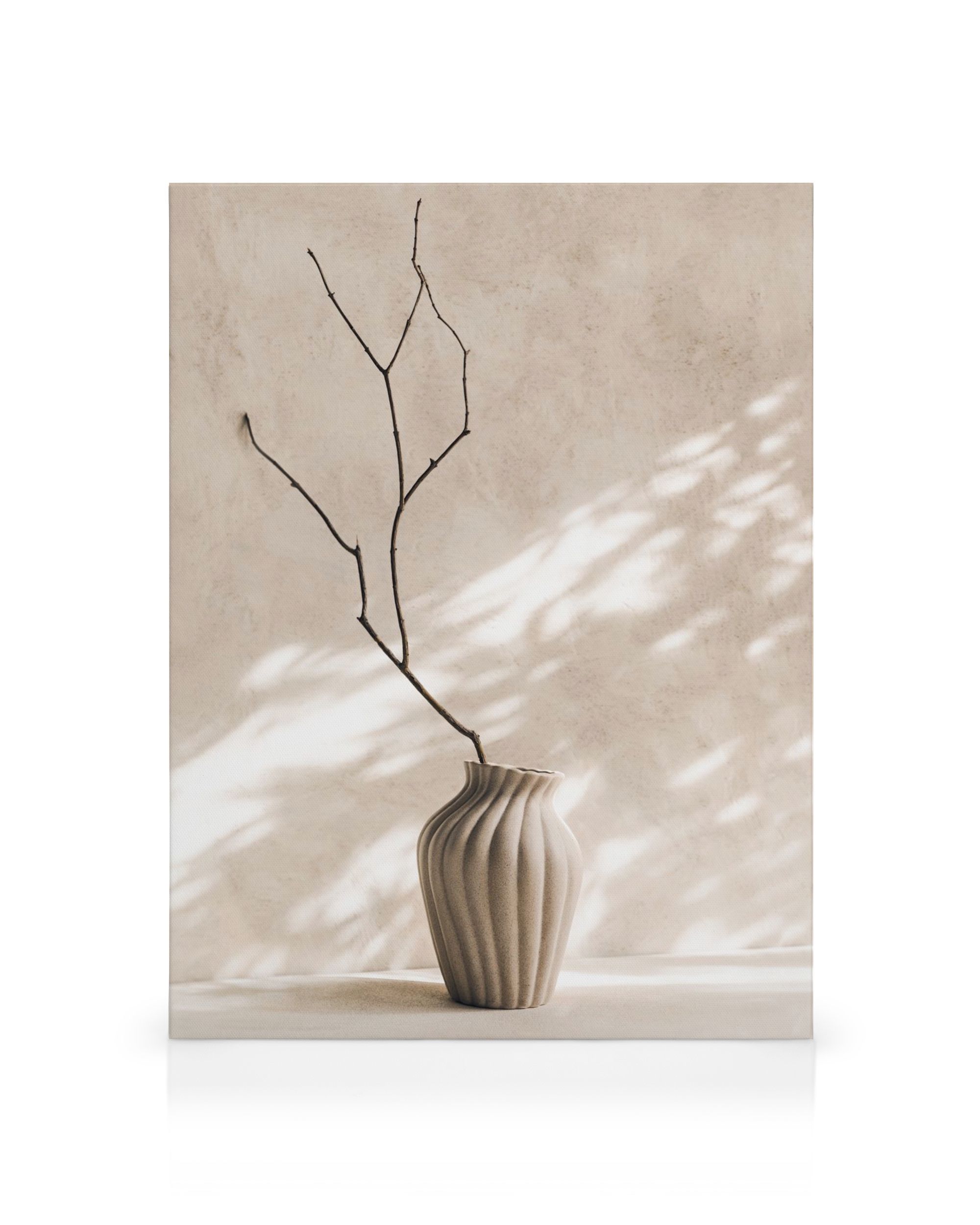 Ab CHF 13.17Ein minimalistisches Leinwandbild mit einer beigen Vase mit wellenförmigen Linien, die einen kahlen Zweig vor einem hellen Hintergrund hält.