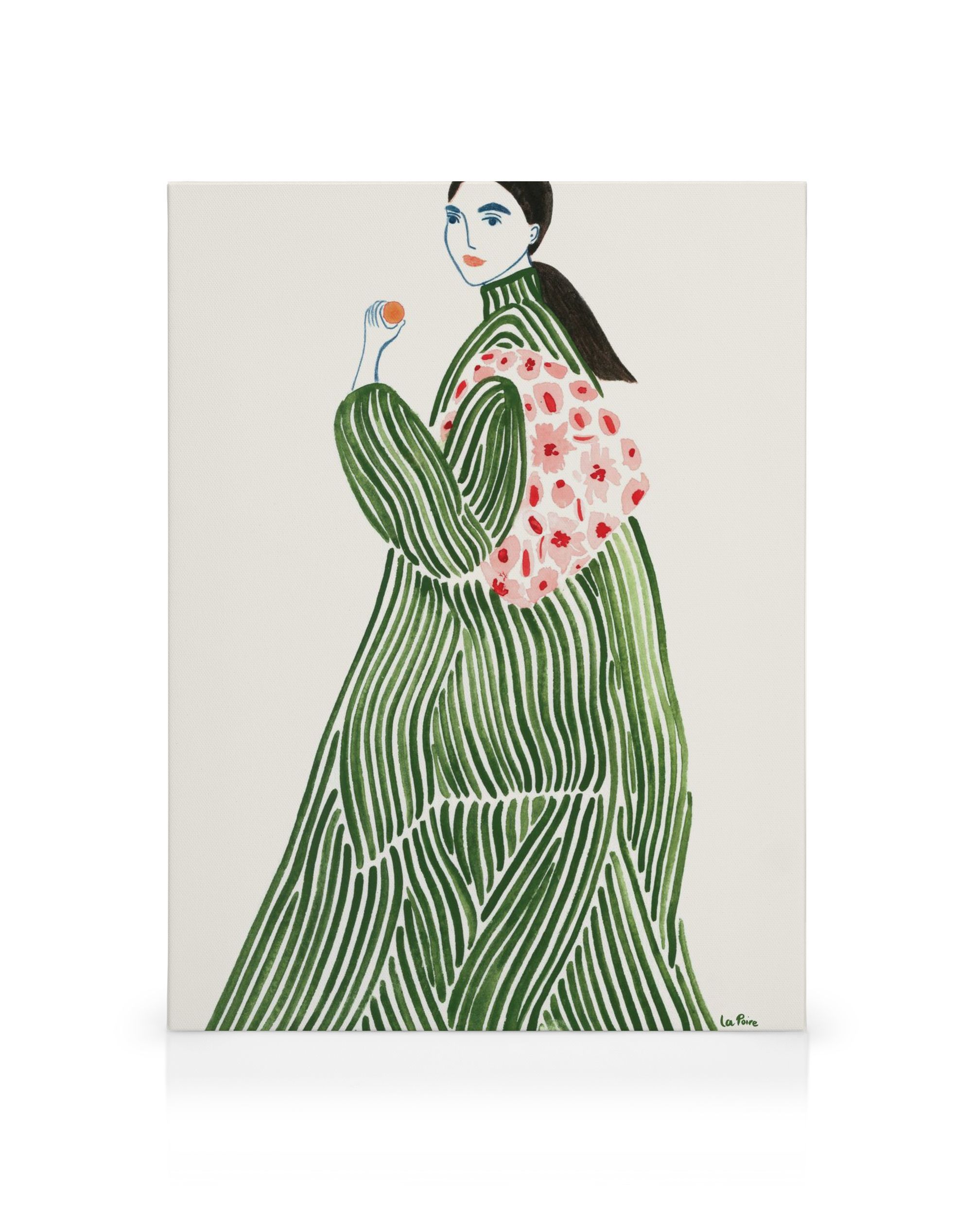 Illustration einer Frau, die ein grünes gestreiftes Kleid und eine weiße Handtasche mit rosa Blumen darauf trägt, alles auf einem hellbeigen Hintergrund. Trendy Leinwand mit einem einfachen und eleganten Look.