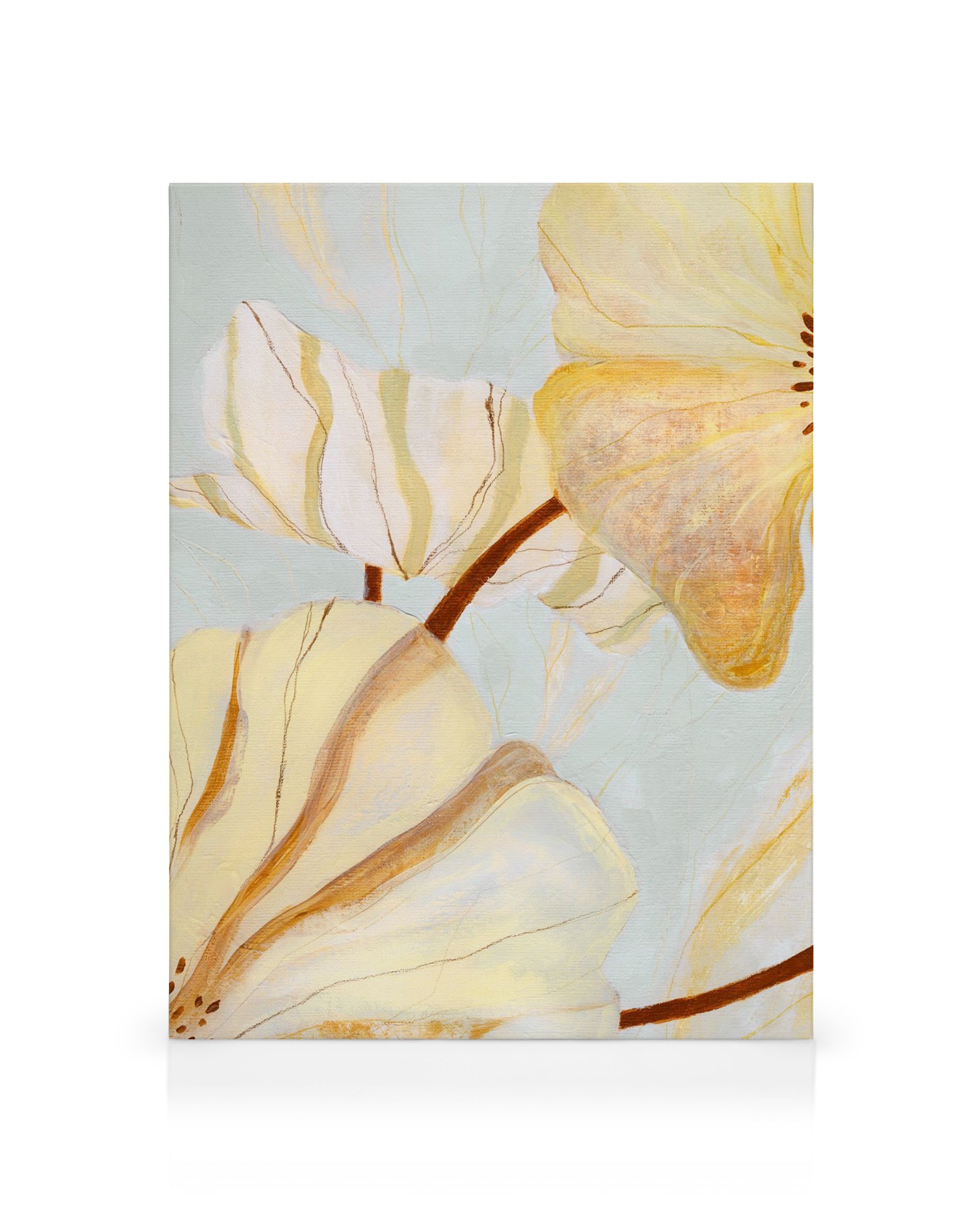 Ab CHF 20.62Ein Leinwandbild mit großen gelben und braunen Blumen auf hellblauem Hintergrund. Ein wunderschönes Stück, das jedem Raum Wärme verleiht.
