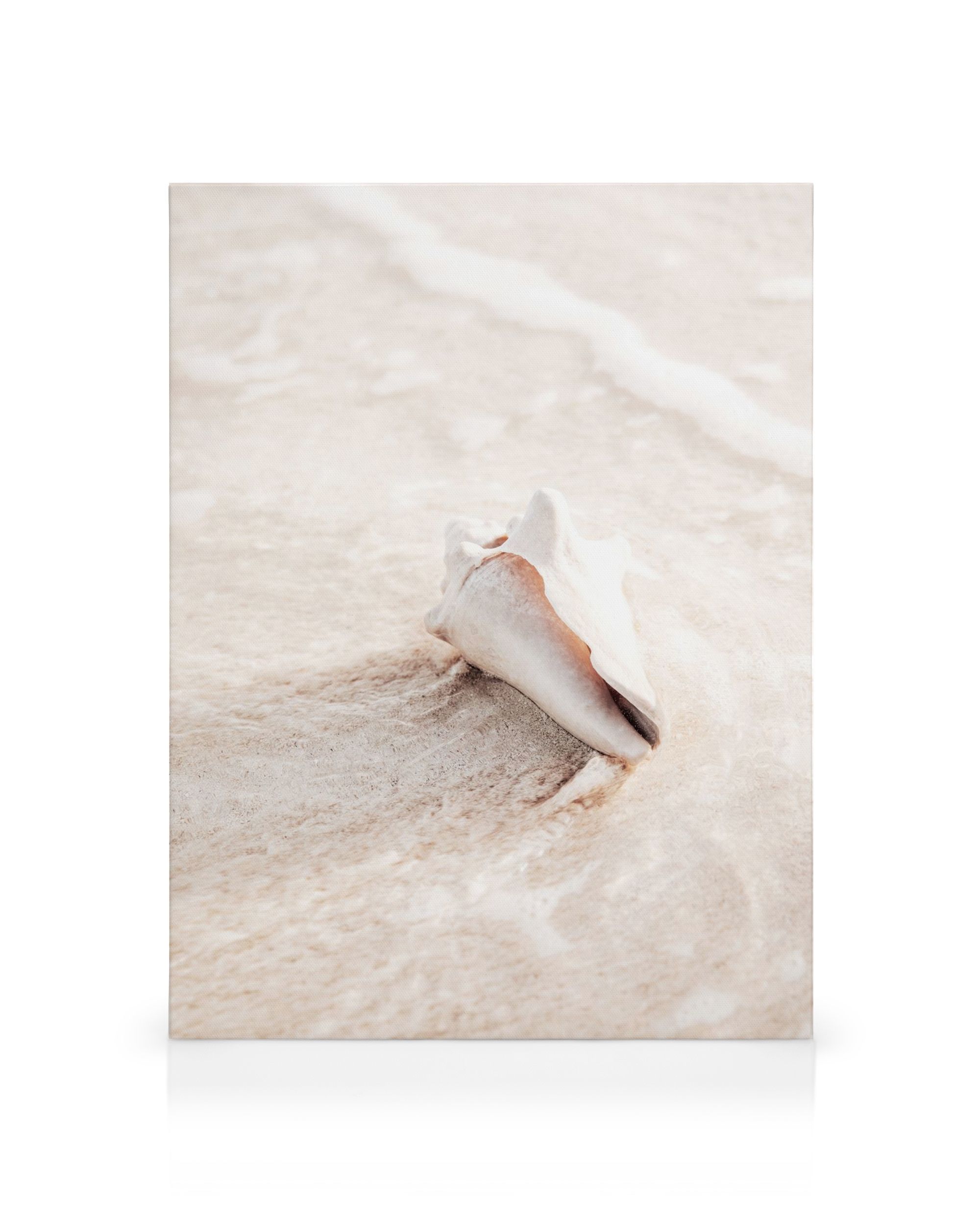 Fotografie einer Muschel, die auf dem beigen Strandsaum im Wasser liegt. Wenn dir Freiheit wichtig ist und du möchtest, dass dein Zuhause ein Ort ist, an dem du dich entspannen kannst, ist dieses Wandbild perfekt für dich!