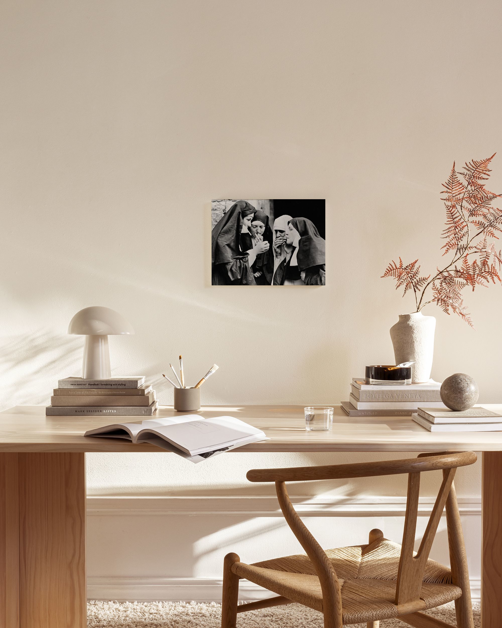 Ein schwarz-weißes Leinwandbild von vier Nonnen in dunklen Gewändern und Schleiern, die gemeinsam Zigaretten anzünden. Ein auffälliges und einzigartiges Stück Wandkunst.