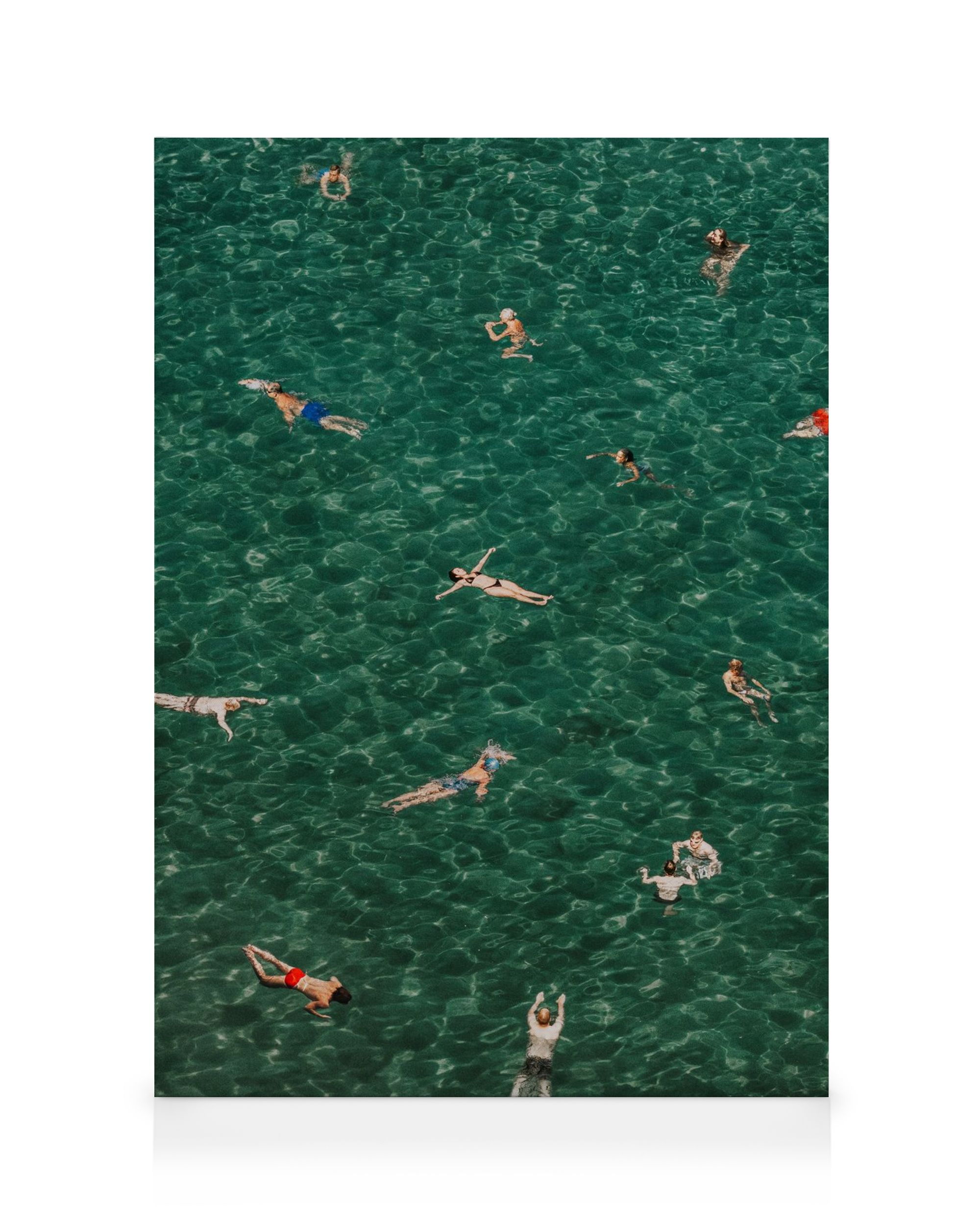 Ab CHF 41.95Drei Leinwandbilder mit einer Küstenstadt, Schwimmern in grünem Wasser und einem Auto mit Gepäck in grünen und beigen Tönen.