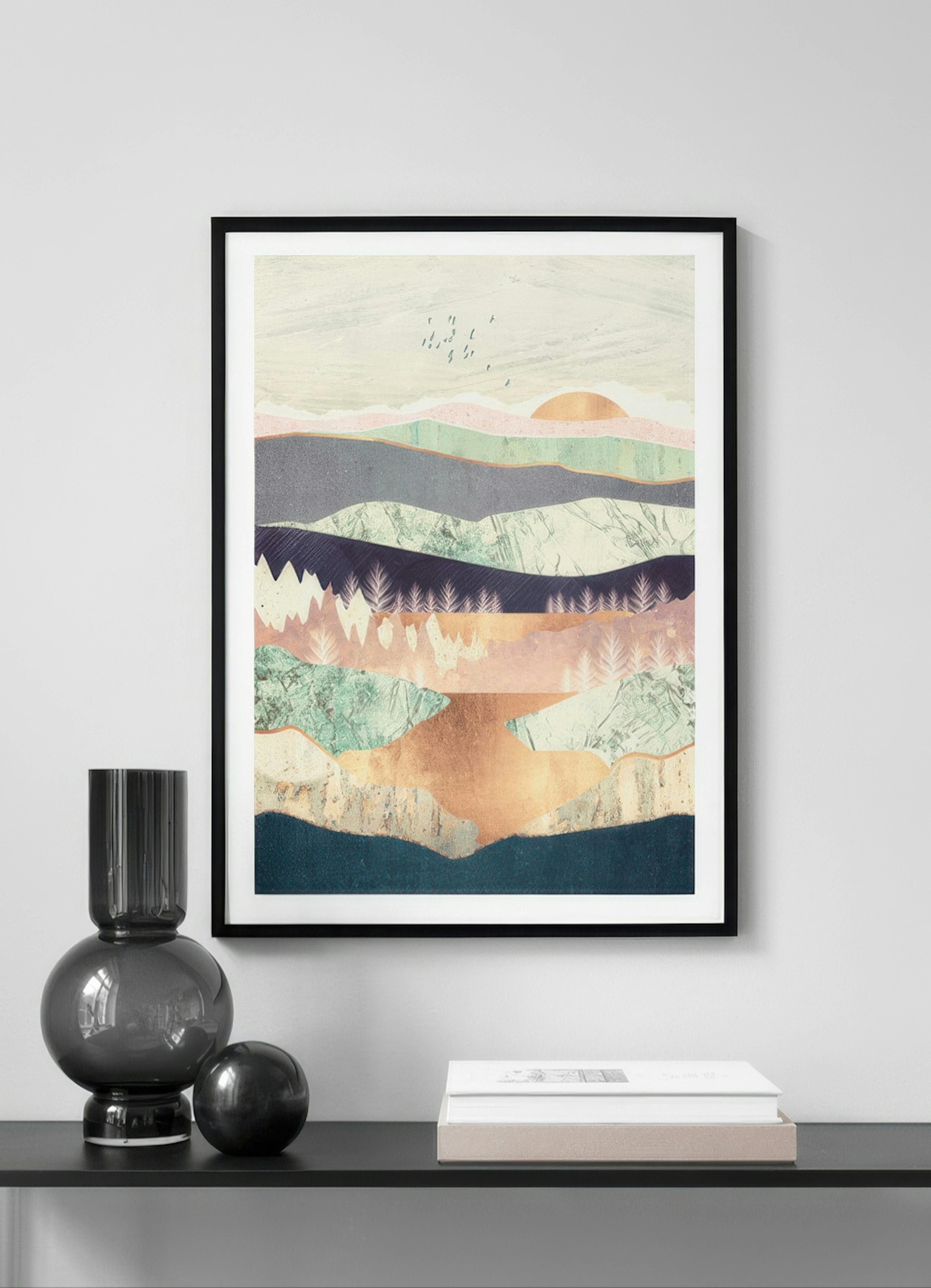 Grafische Illustration einer bunten, abstrakten Landschaft in verschiedenen Farben und Mustern. Bringe mit bunter, einzigartiger Kunst einen modernen Look in dein Zuhause! Weitere passende Poster findest du in der Kategorie Grafik.