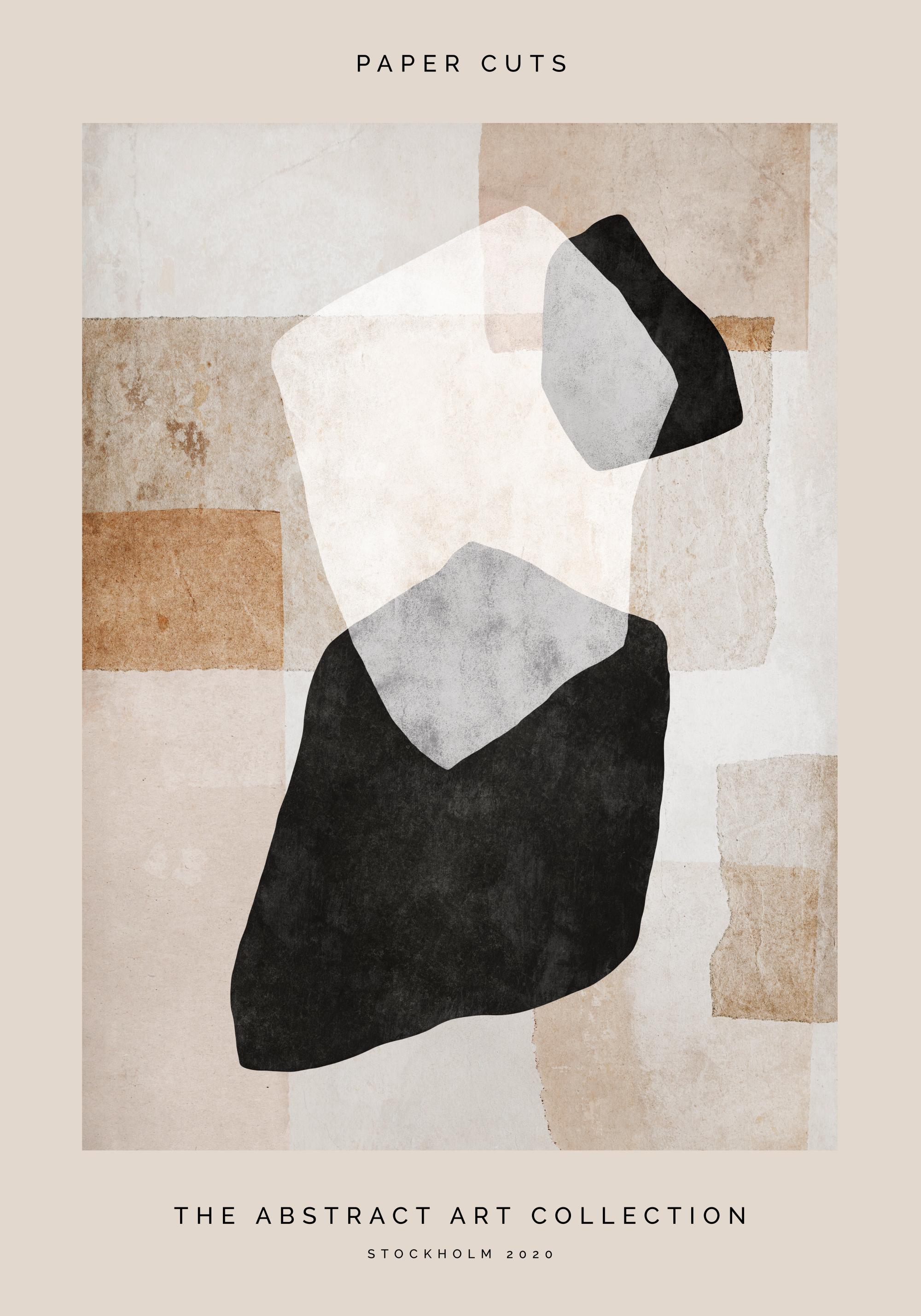Abstrakte Illustration mit Papierstücken in Schwarz und Weiß auf einem beigen Hintergrund und Text darüber und darunter. Auf der Suche nach einem künstlerischen Look? Zusammen mit Paper Cuts No2 ist dieses Poster ein perfektes Paar, das wunderbar an eine kleinere Wandfläche im Flur oder Wohnzimmer passt!