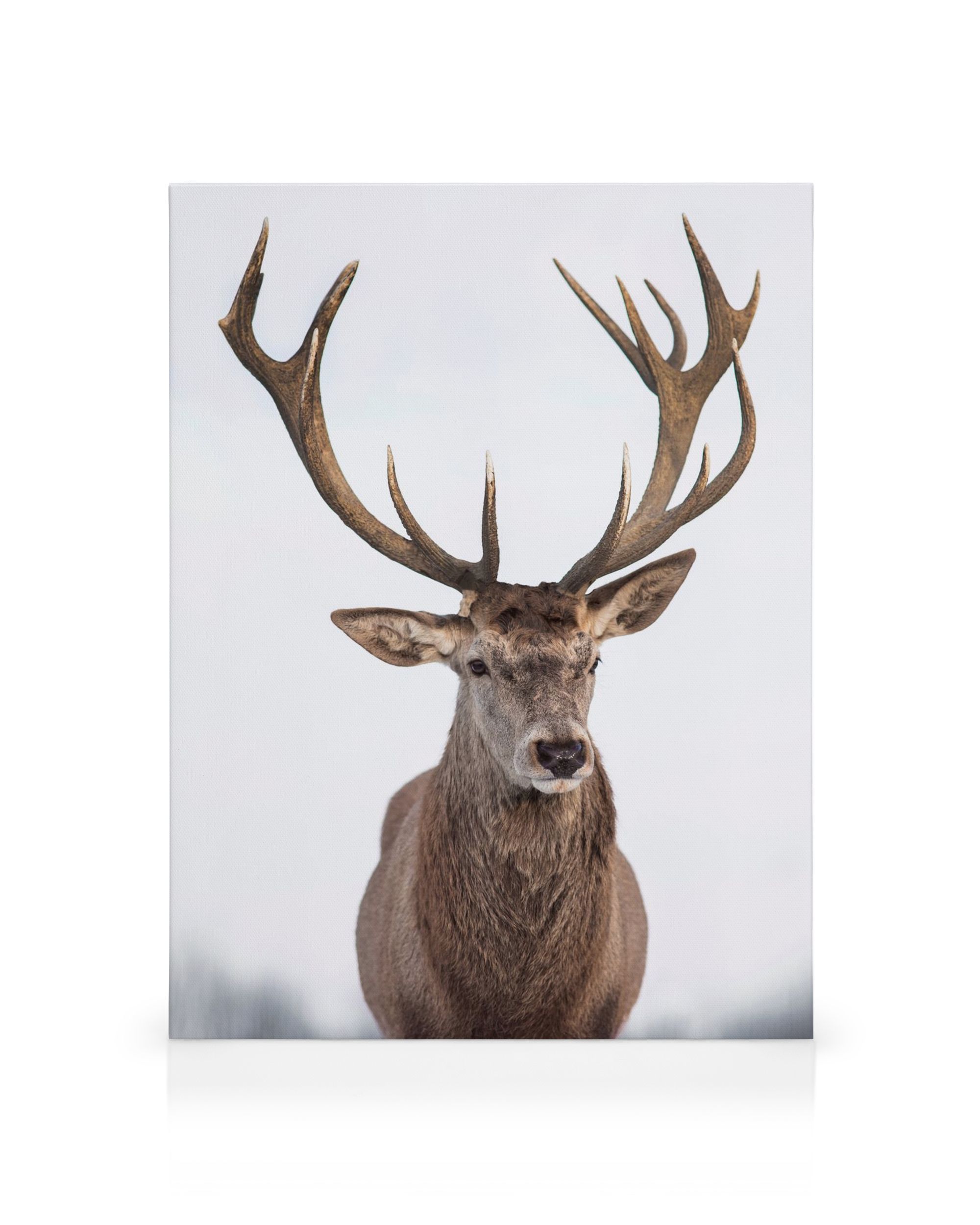 À partir de 41.95 CHFUne toile représentant un cerf brun avec des bois ramifiés majestueux, une fourrure texturée et des oreilles dressées sur un fond doux blanc et gris clair. Une décoration murale époustouflante pour votre maison.