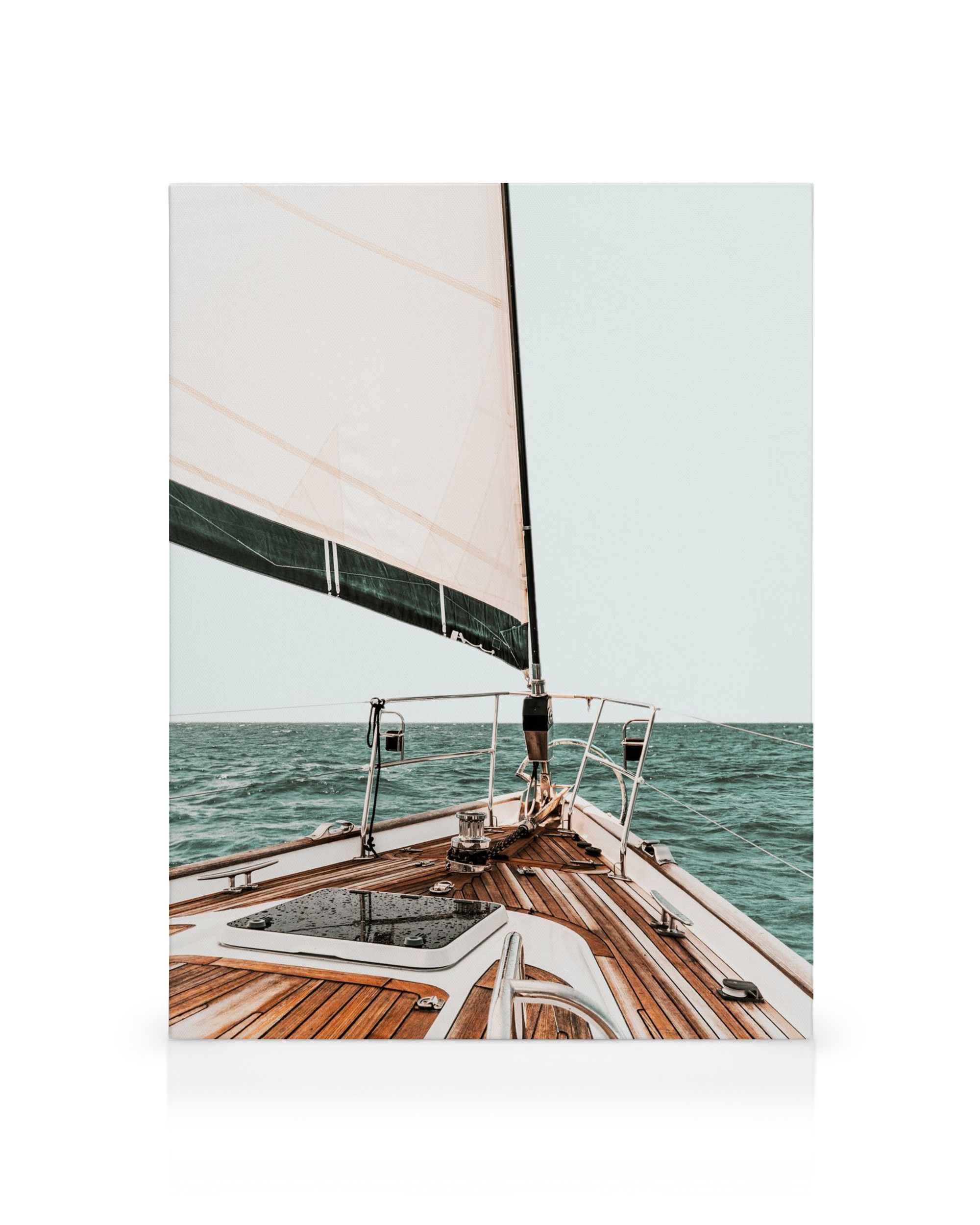 À partir de 41.95 CHFUne toile apaisante montrant le pont d'un voilier, avec un plancher en bois et une voile blanche contre une mer et un ciel bleus.