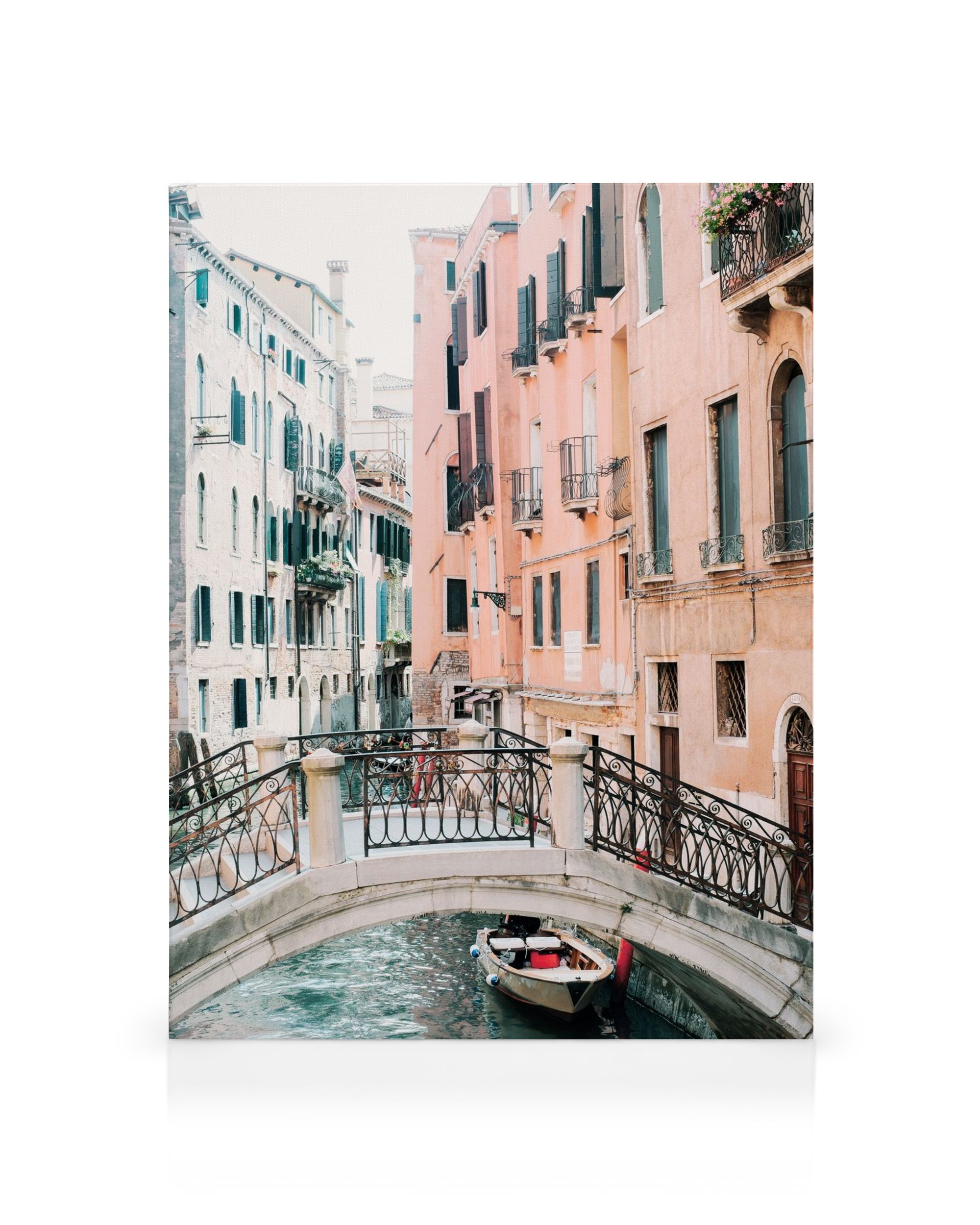 À partir de 41.95 CHFUne charmante toile représentant un petit bateau amarré sous un pont dans un canal, avec de grands bâtiments roses et blancs bordant le bord de l'eau.