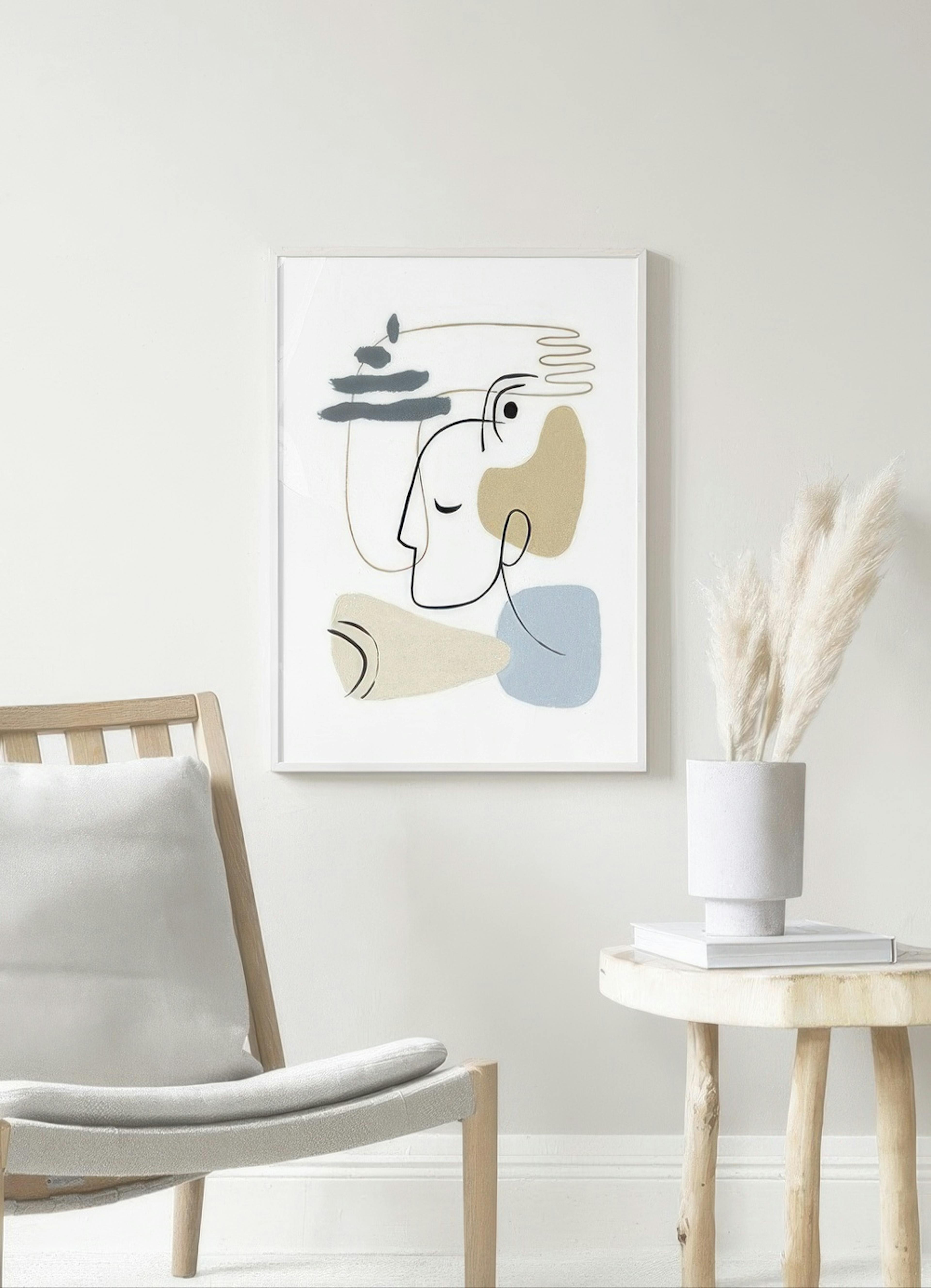 Illustrazione di un volto astratto e una mano in stile line art e forme astratte beige e blu, su sfondo bianco. Le tonalità delicate, combinate con le linee morbide di questo soggetto armonioso, sono ideali per creare ambienti accoglienti e rilassanti. Abbinalo ad Abstract Forms No2 e crea la coppia perfetta!