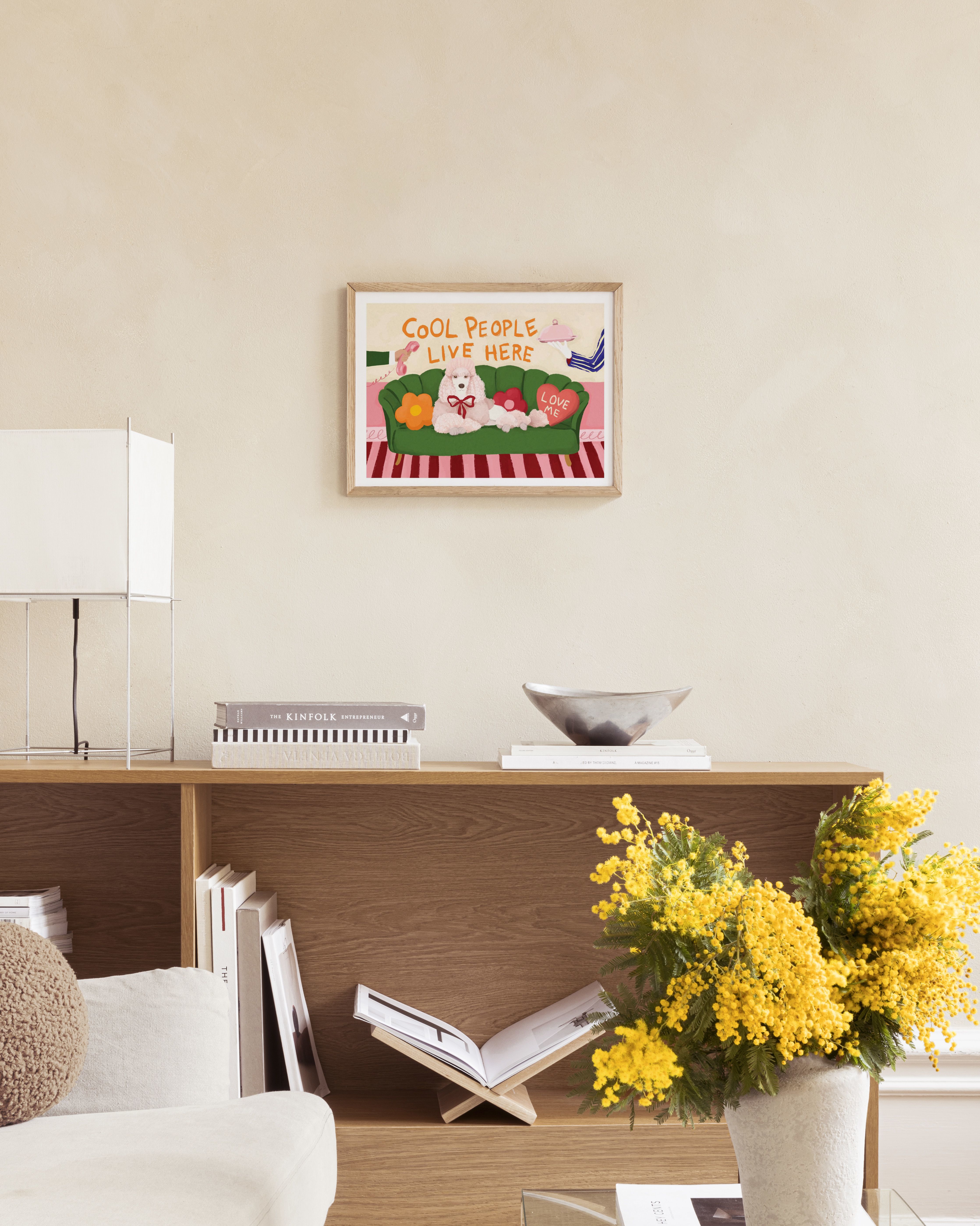 Questa illustrazione ritrae un barboncino rosa su un divano verde, circondato da cuscini a forma di fiore e cuore. Un poster giocoso in colori vivaci con la scritta "Cool people live here" nella parte superiore. Questo è un poster esclusivo della collezione Desenio x Dani Klaric.